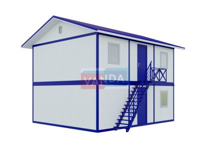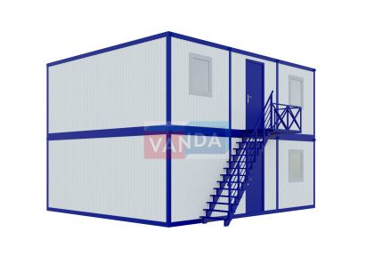 • многофункциональность использования. На первом этаже двухэтажного блок контейнера может располагаться пот охраны или пропускной пункт, а на втором этаже сам офис. Бытовка под офис может применяться не только для работы. Теплоизолирующие свойства пленки позволяют обустроить санузлы, душевые, раздевалки. Также можно часть здания использовать, как временную кухню или склад.